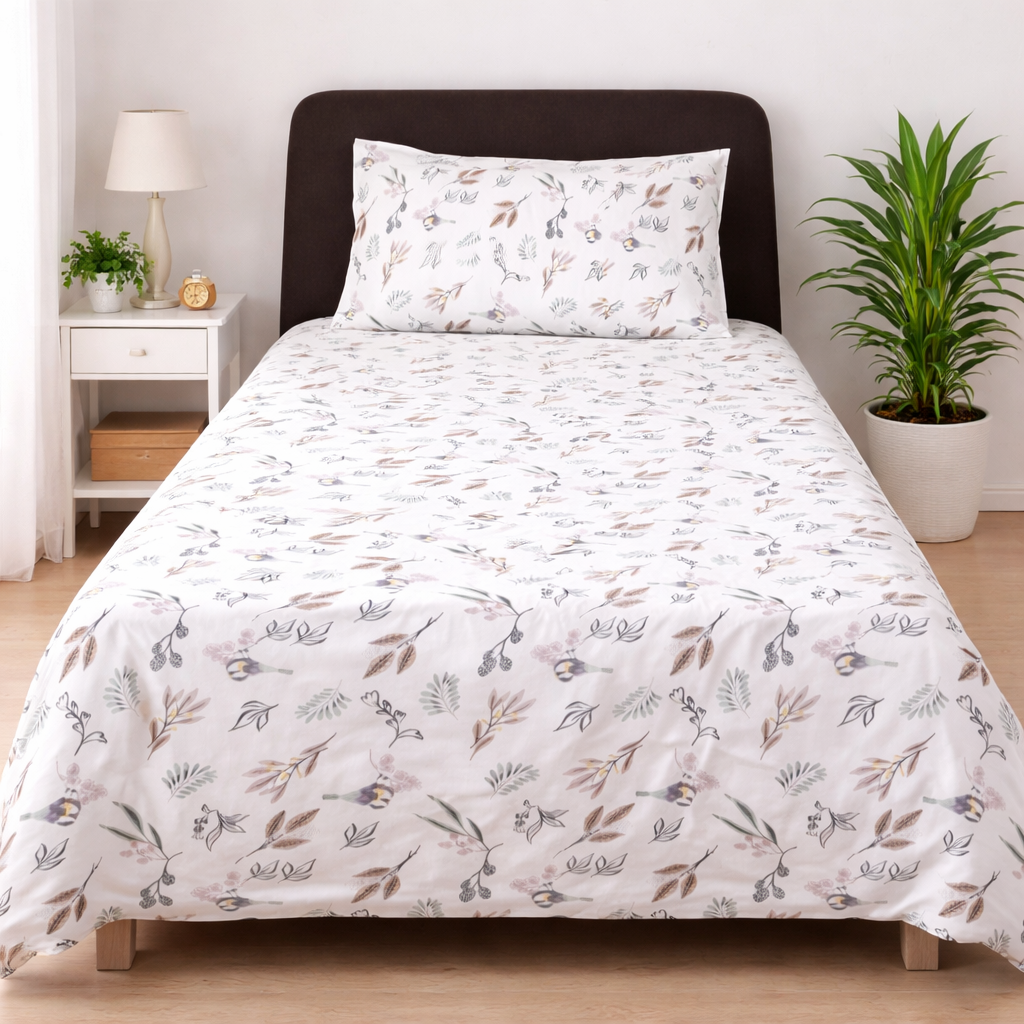 Refresh your bedroom with the subtle elegance of Urban Hub’s Whispering Botanics Single Bedsheet. Featuring a soft botanical print in calm, neutral tones, this bedsheet is crafted from export-quality fabric that feels smooth, breathable, and gentle on the skin. Designed for everyday comfort, its premium finish and durable stitching ensure long-lasting use without compromising on style.