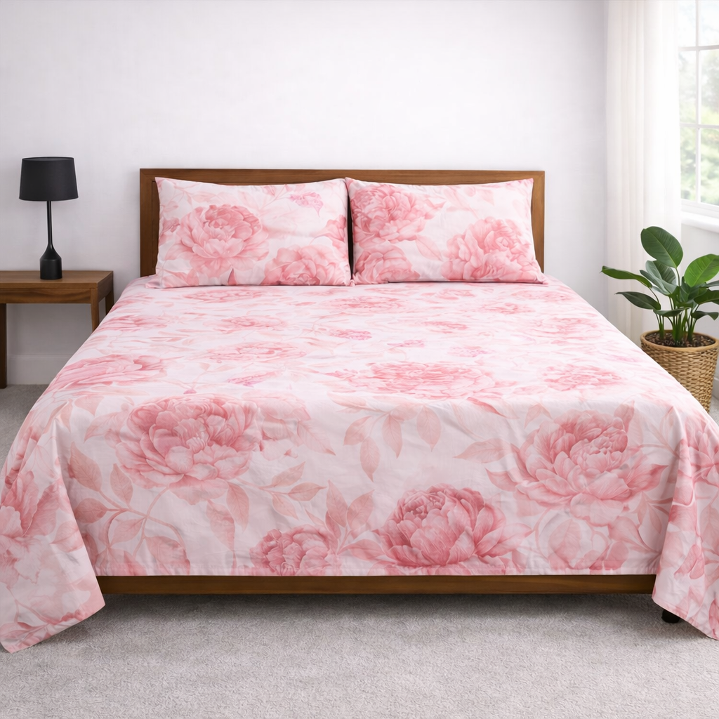 Wrap your bedroom in elegance with our Blush Peony Double Bedsheet Set. Featuring a delicate floral pattern in soft pink hues, this export-quality bedsheet offers a smooth, breathable feel for everyday comfort. Paired with matching pillow covers, it’s perfect for creating a serene and graceful sleeping space.